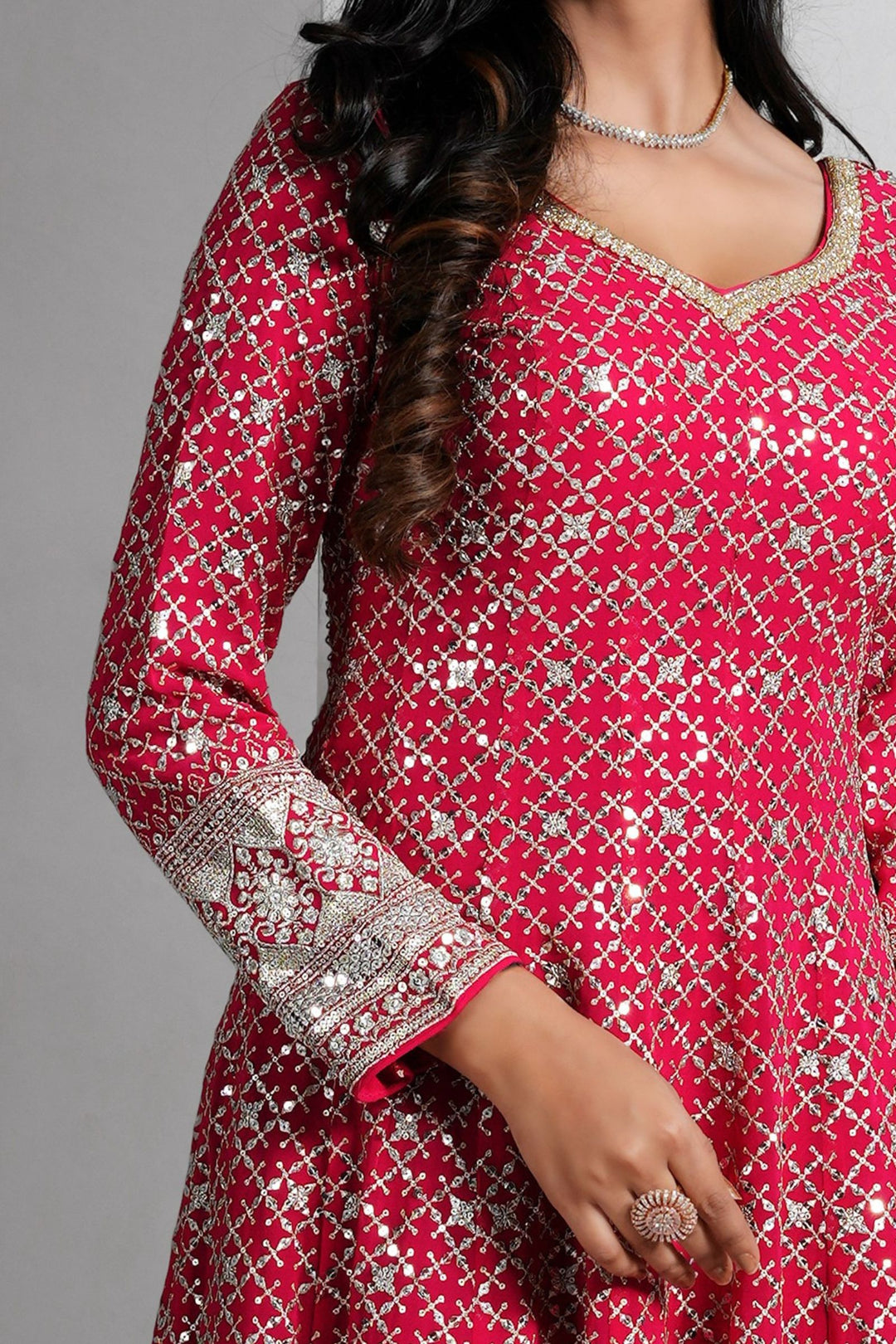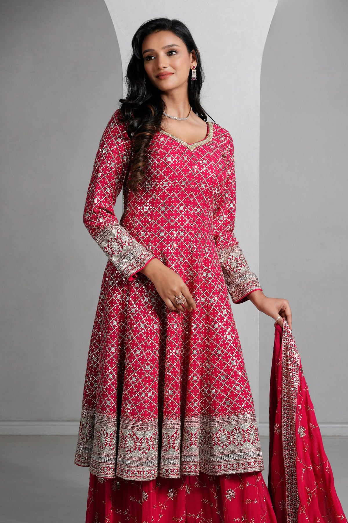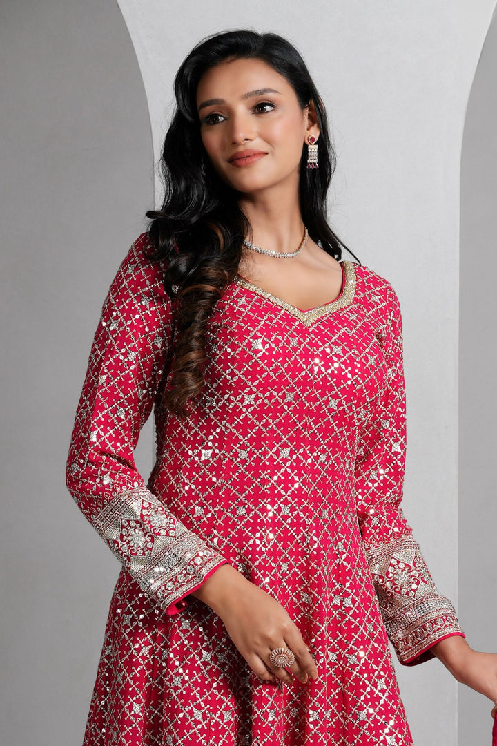 Rani Pink Silver Zari and Sequins work Anarkali Style Salwar Suit with Palazzo Pant