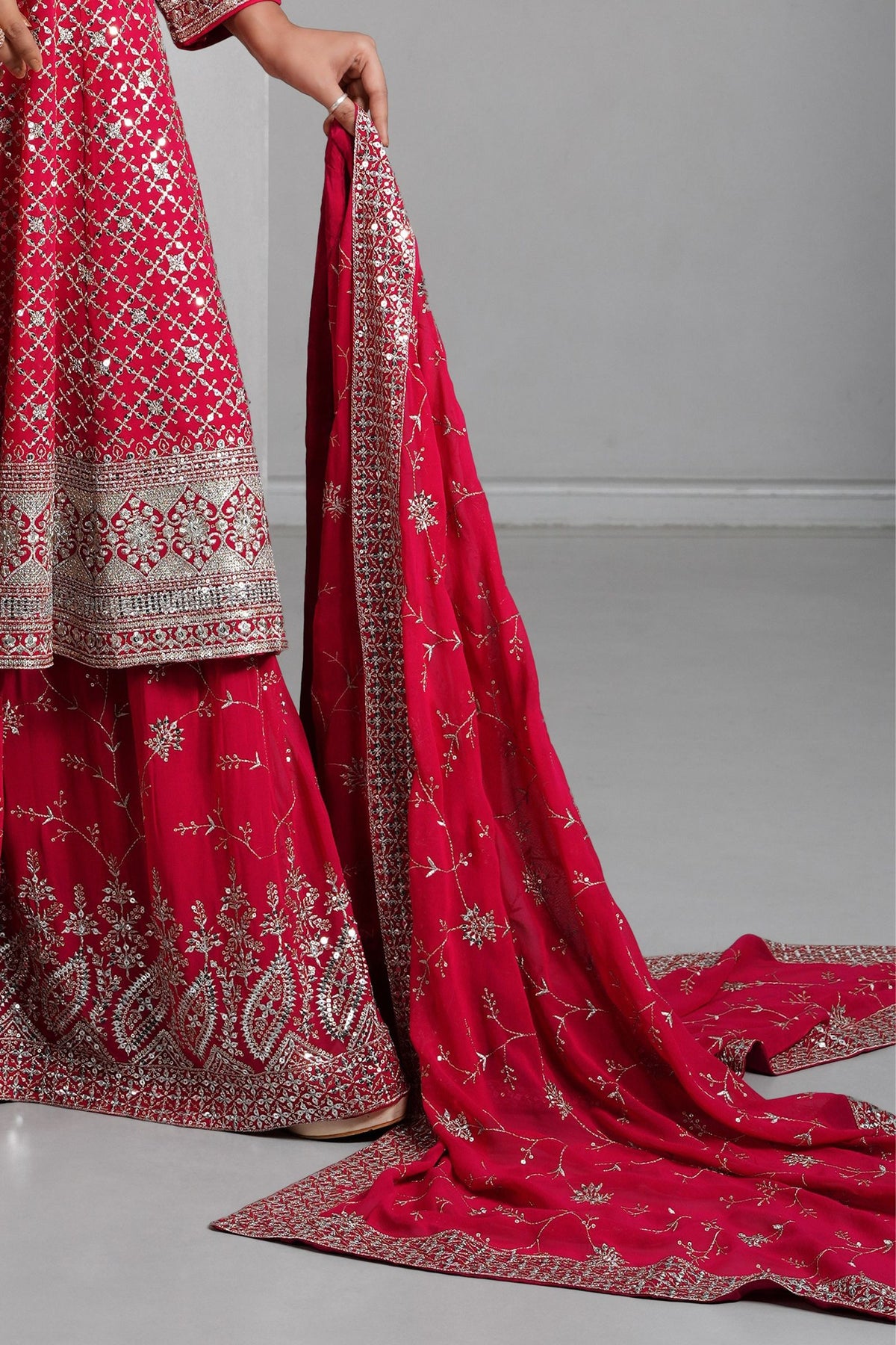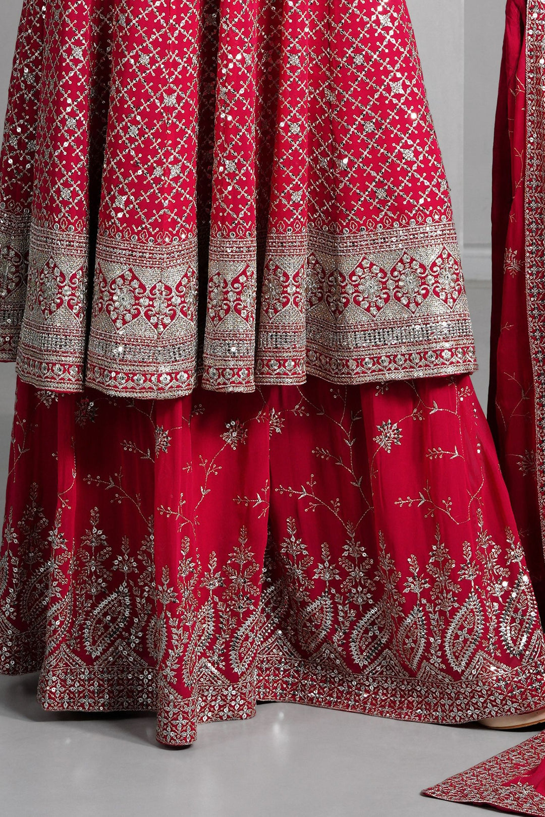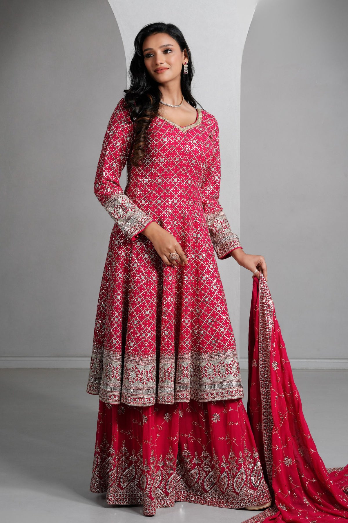 Rani Pink Silver Zari and Sequins work Anarkali Style Salwar Suit with Palazzo Pant