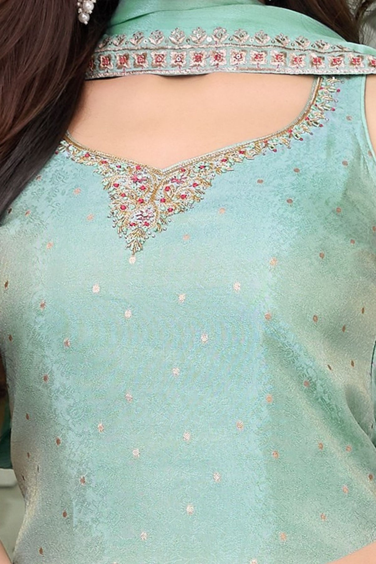 Sea Green Banaras, Zardozi, Mirror, Stone, Thread and Zari work Palazzo Salwar Suit