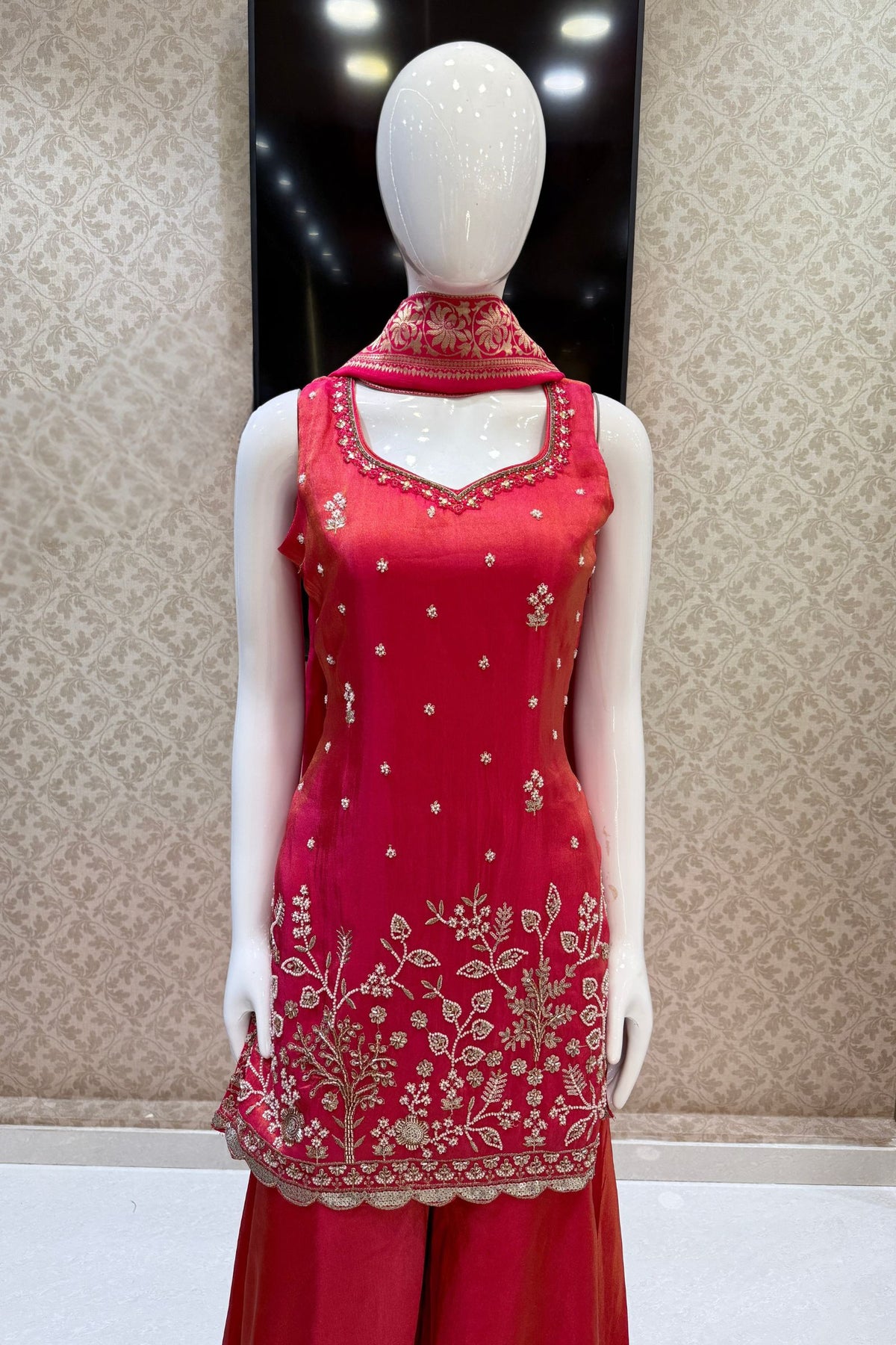 Tomato Red Beads, Sequins, Zari and Mirror work Palazzo Salwar Suit with Banaras work Dupatta