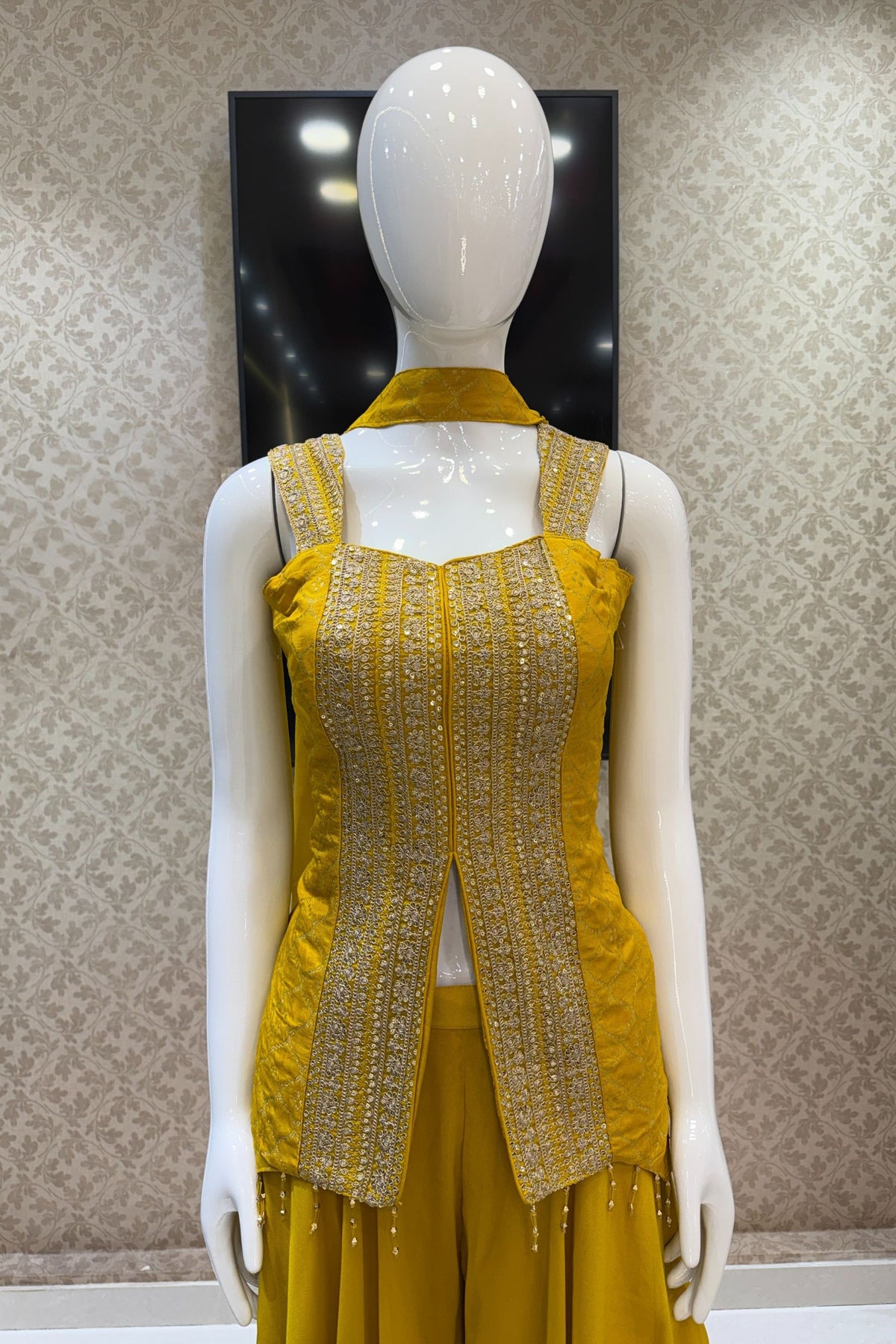 Yellow Banaras Zari, Sequins and Zari Thread work Palazzo Suit Set