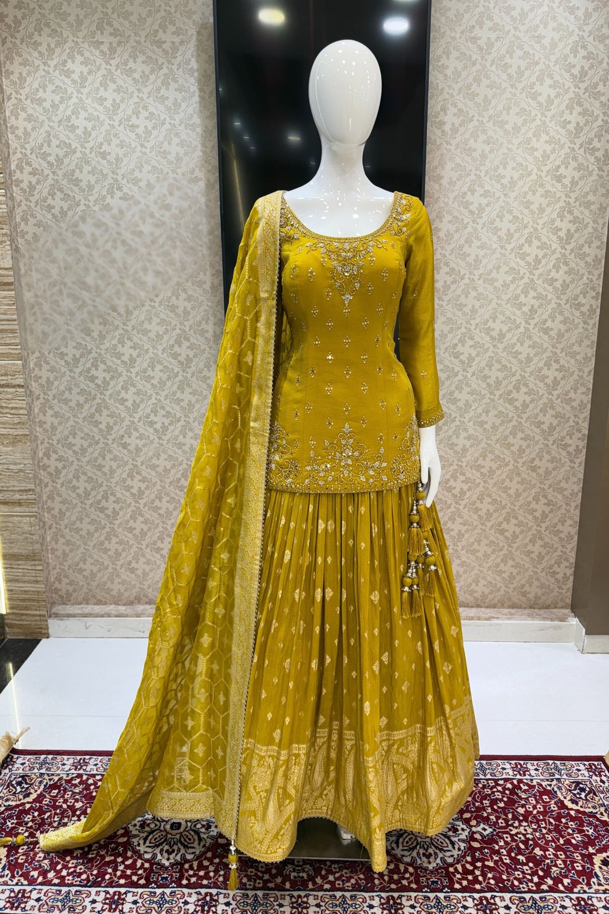 Yellow Mirror, Stone, Sequins, Zari, Beads and Banaras work Top with Lehenga