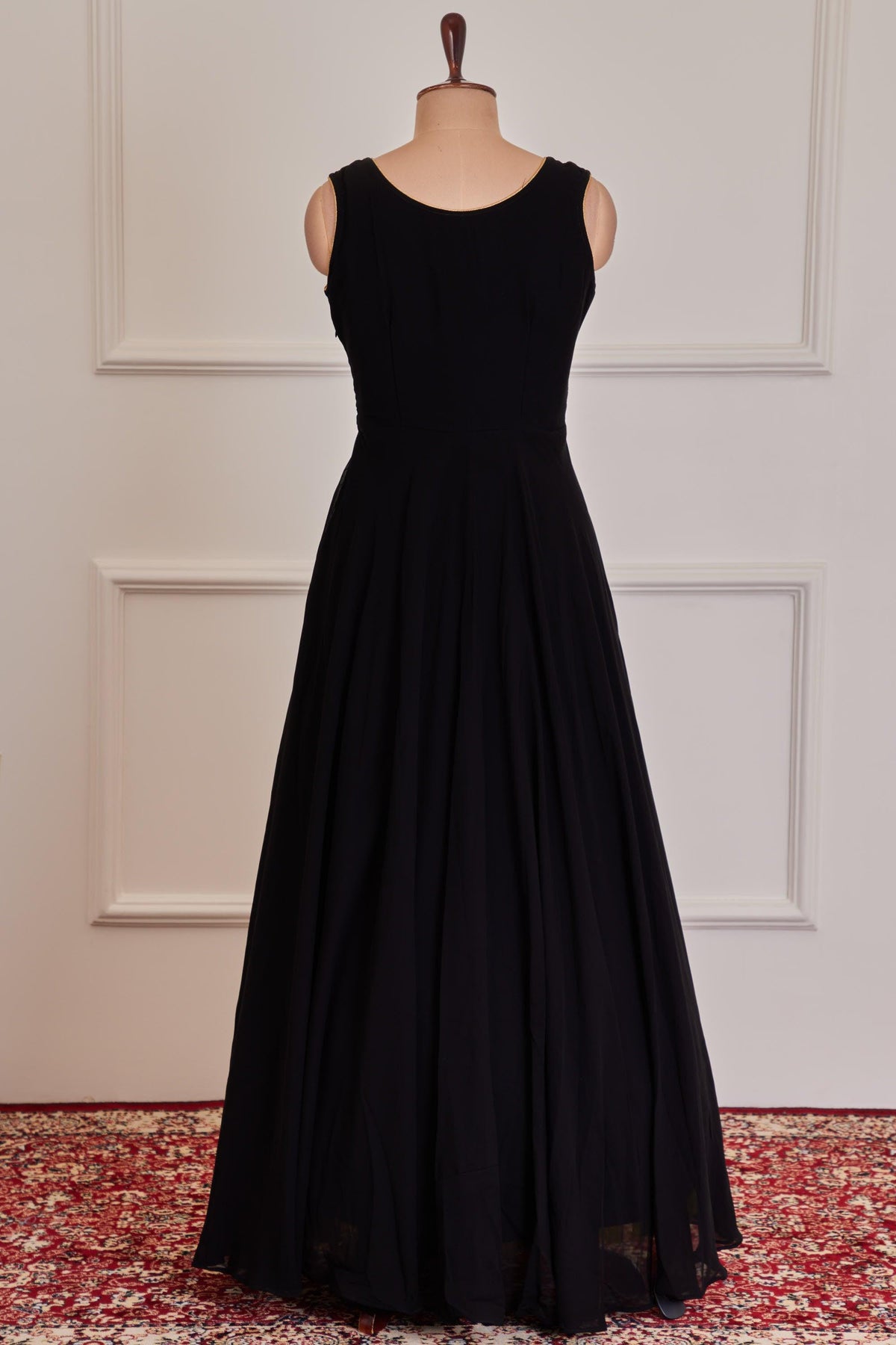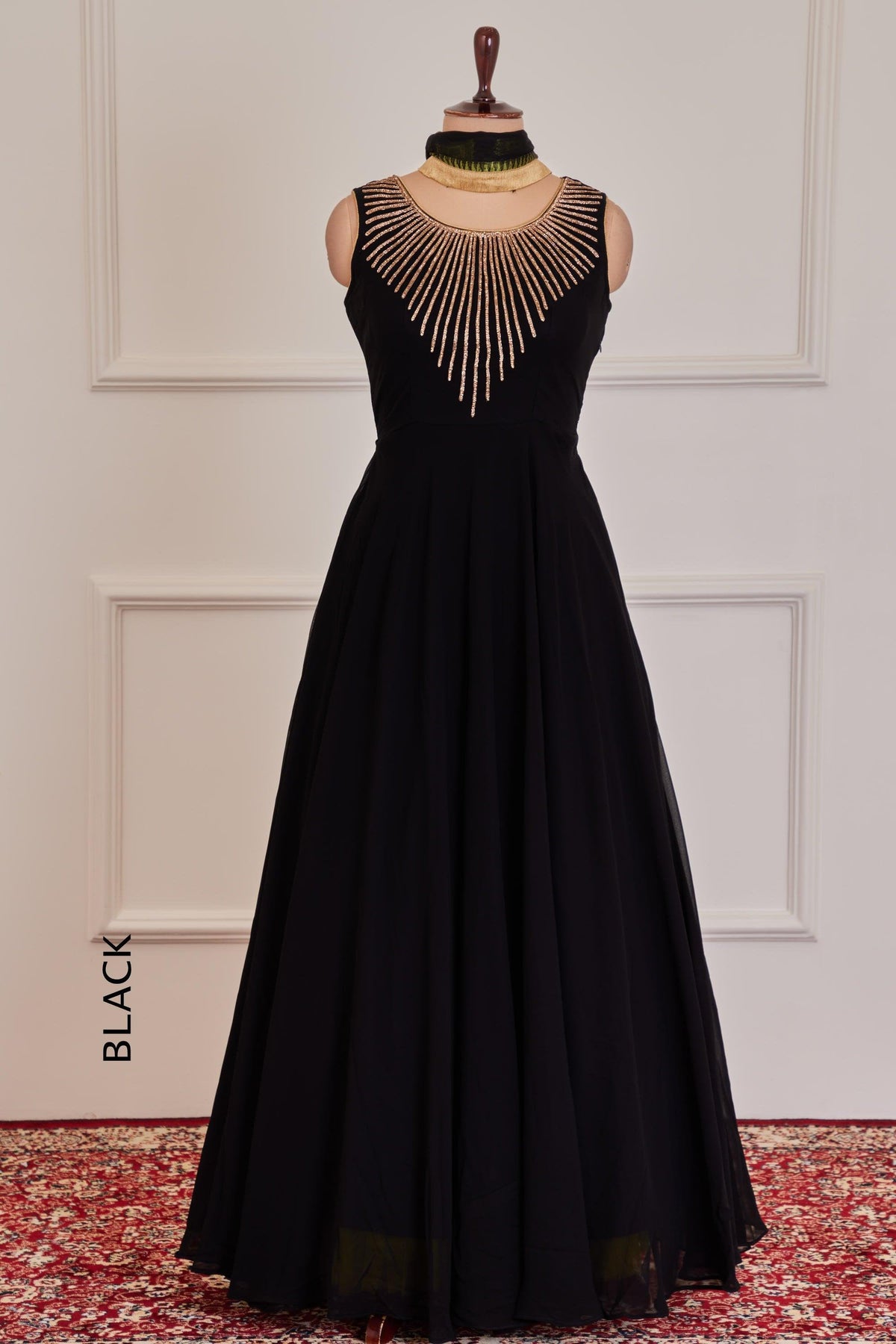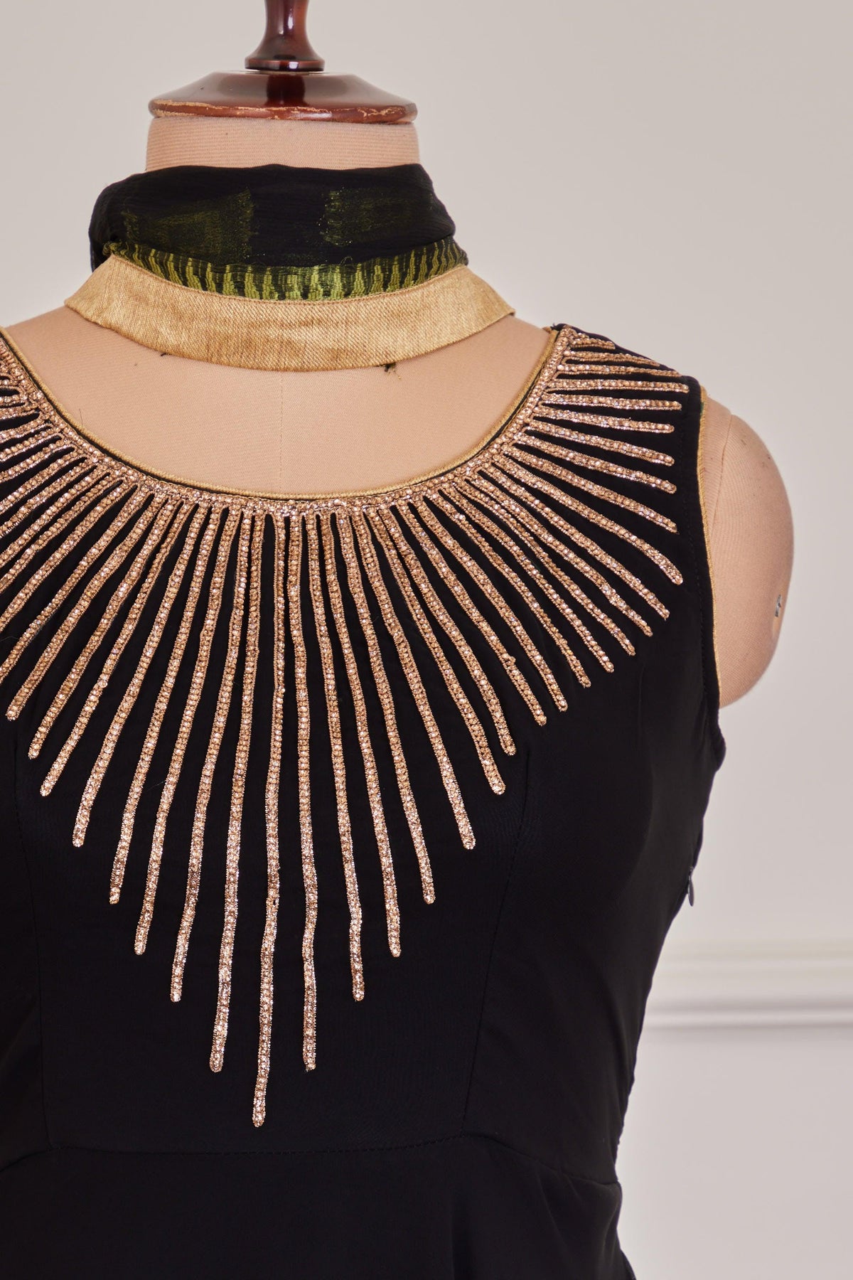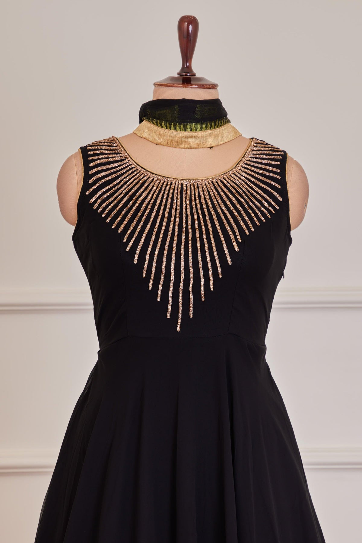 Upgrade your party fashion with this amazing anarkali suit in black fabricated on georgette fabric. This outfit is decorated with stone work near the neckline with layered elegant flare tapering down till the floor length. Comes with 3/4th georgette sleeves, this elegant outfit is completed with matching chiffon dupatta embellished with banaras work and a matching satin lycra bottom.